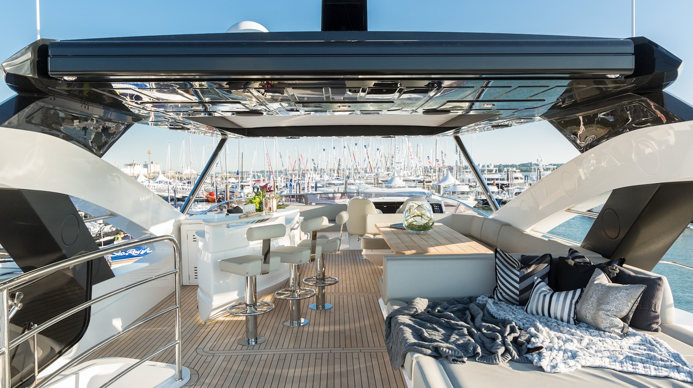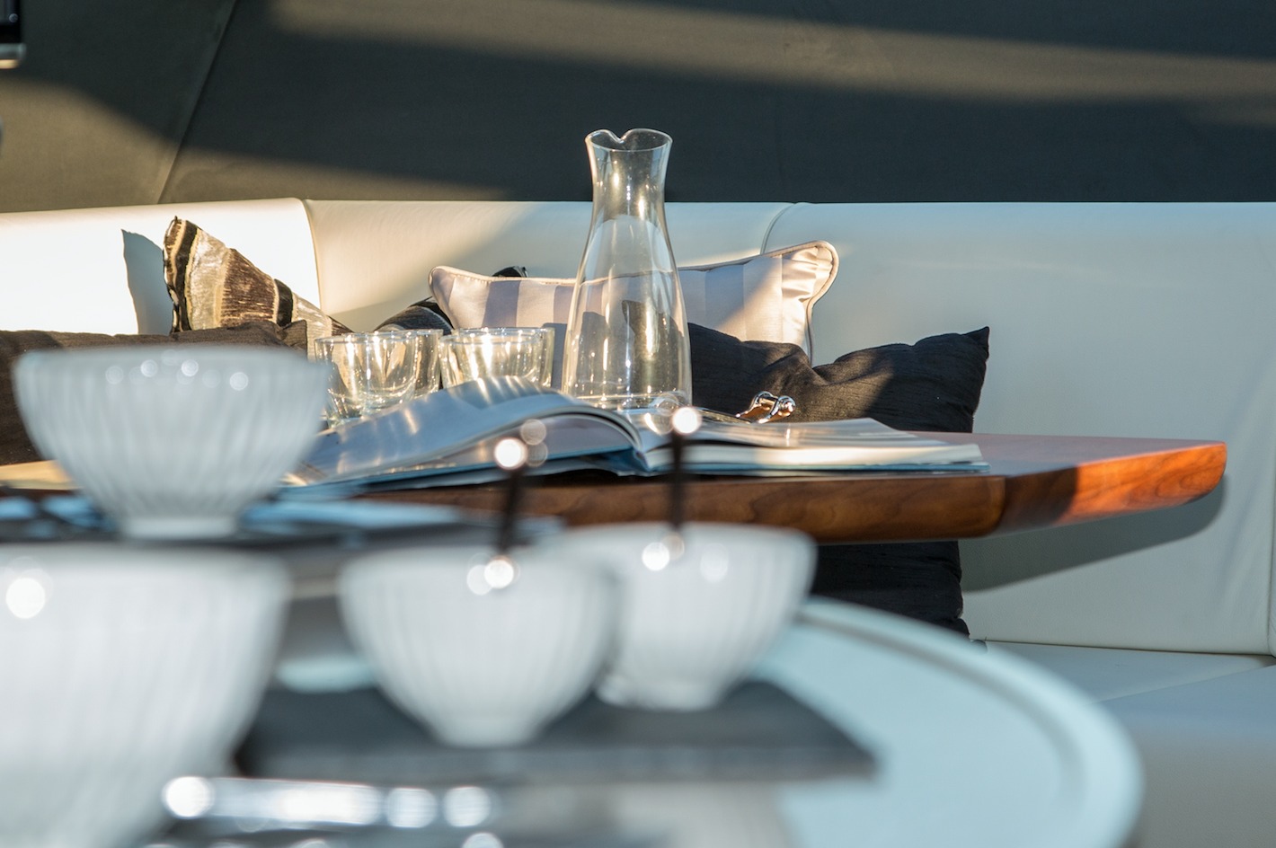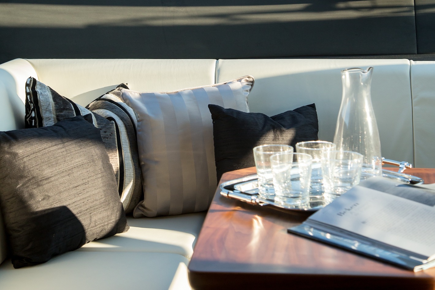 The internal styling was mirrored on the fly bridge; the black and white exterior of the boat embellished by the deluxe faux fur throws and heavy cable knit blankets. When paired with black and white striped cushions, these not only complimented the exterior but also added a taste of the elegance and glamour found throughout the boat.