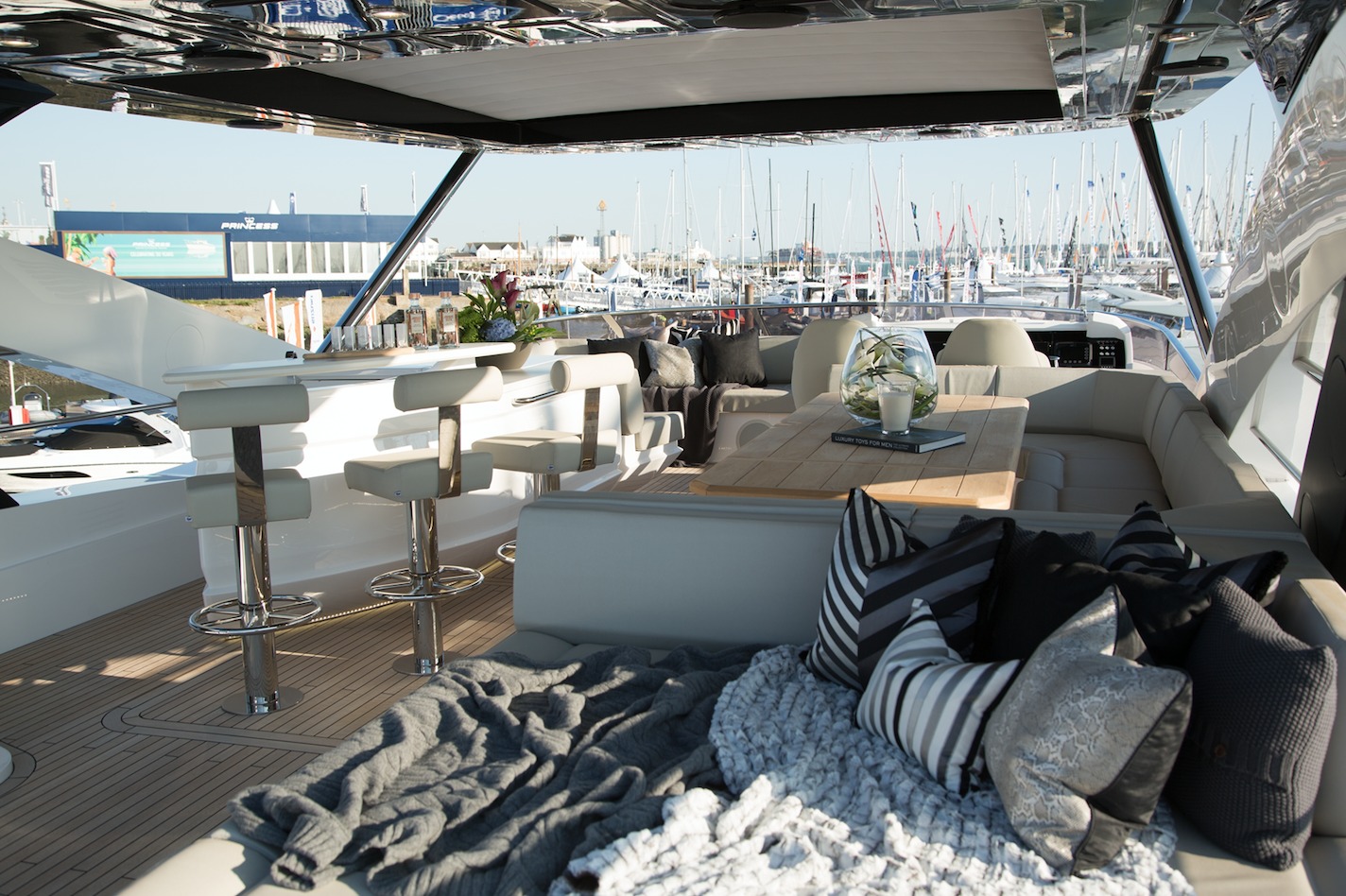 The styling was inspired by the luxury yacht lifestyle and, with the intention of showing boat show guests how the 86 Yacht can be a home from home, the scheme embraced a contemporary twist on the nautical theme. Centring on a modern and monochromic palette, the plush cushions in black, white, taupe and grey were paired with chrome and ocean inspired accessories chosen specifically to embellish the luxurious furnishings found on board the 86 foot masterpiece.