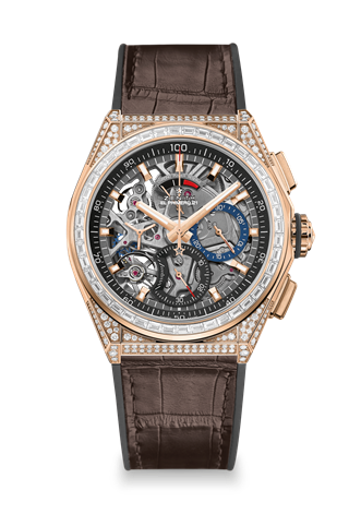 Already a statement piece with its unrivalled 100th of a second chronograph movement and resolutely contemporary looks, the DEFY El Primero 21 High Jewelry pushes boundaries even further. With a rose gold case entirely set with brilliant cut white diamonds and the bezel with baguette cut diamonds, this rendition of the DEFY El Primero 21 turns the exceptional into outstanding.