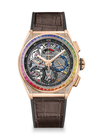 And if diamonds aren’t enough, the DEFY El Primero 21 High Jewelry Rainbow is as joyfully festive as it is an enchanting combination of watchmaking and gem-setting prowess coming seamlessly together. On the rose gold case, white diamonds of varying sizes are applied in a seemingly random pattern, in a technique known as snow setting. The bezel takes on the vibrant “rainbow” treatment, where 44 baguette-cut sapphires are meticulously picked and arranged in a progressive colour scheme that spans the entire visible light spectrum. This rainbow effect continues on to the open dial, where the hour markers are set with sapphires matching those on the bezel.