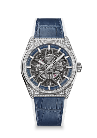 Perfectly proportioned and boasting a uniquely conceived open dial and movement, the DEFY Classic has all the makings of the perfect daily companion. Making this modern icon even more outstanding is the DEFY Classic High Jewelry, with a titanium case set with brilliant cut-diamonds and baguette diamonds on the bezel. This bejewelled edition retains the signature Zenith blue touches throughout, from the dial to the rubber and alligator leather strap.