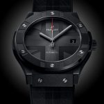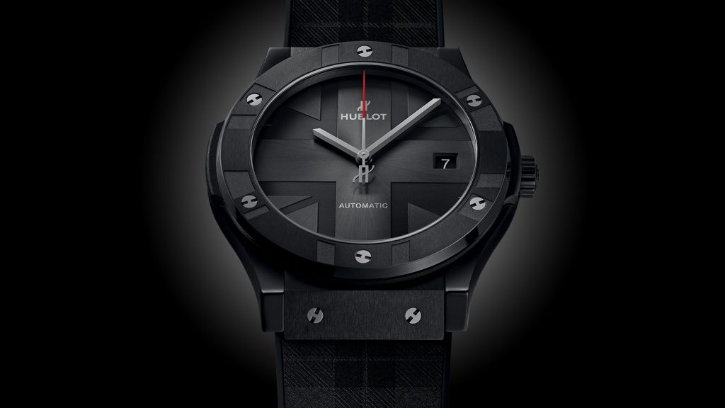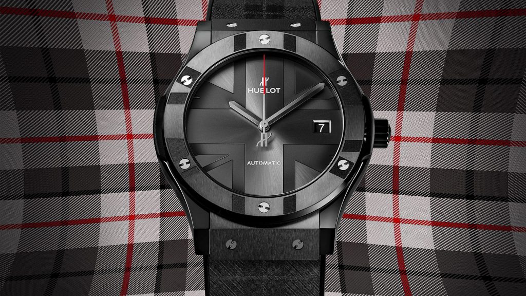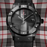 The 45mm black ceramic case houses Hublot’s MHUB1112 automatic movement, which provides the watch with time and date functions and a 42-hour power reserve. A flash of red at the tip of the central second’s hand gives the watch’s monochromatic palette a sporty twist. The sapphire crystal case back is decorated with ‘Hublot Loves London’. The finishing touch is a black rubber strap with a velvet touch representing a playful City of London tartan theme (as listed on The Scottish Register of Tartans) and is water-resistant to 50 meters.