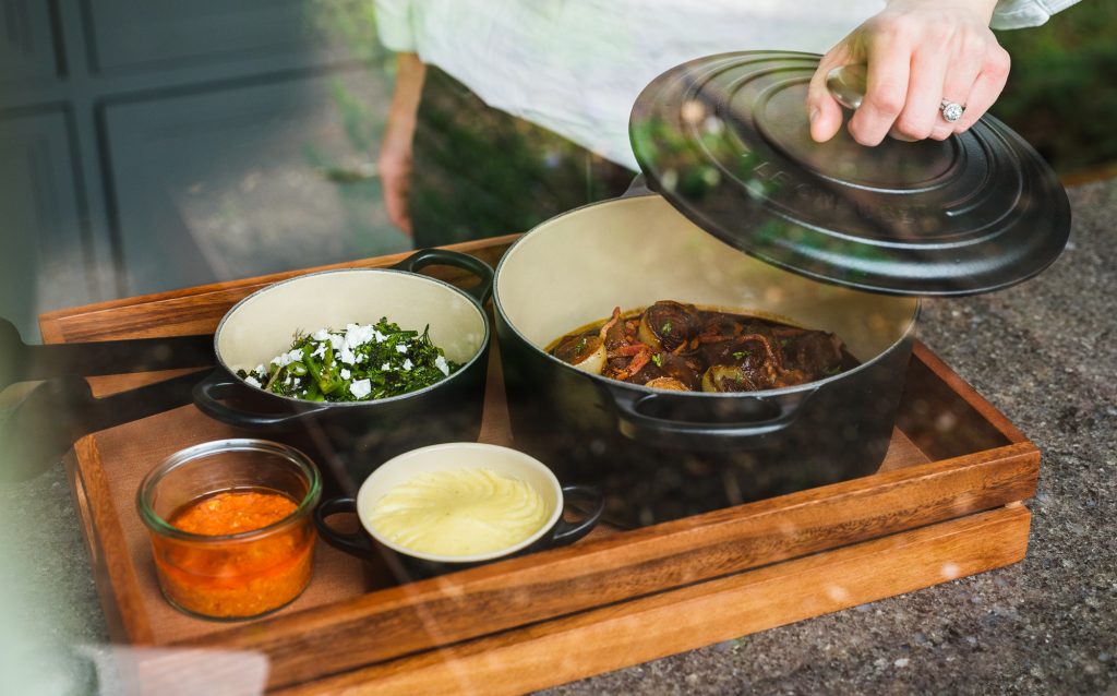Choose from a number of delicious options such as red wine braised beef, Cipollini onion, mushroom, smoked bacon and slow-roasted pork, fermented cabbage, apple, and fennel. Their pre-prepared meals are designed to be enjoyed in your guest house, all you need to do is simply heat, assemble and enjoy.