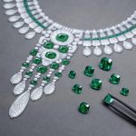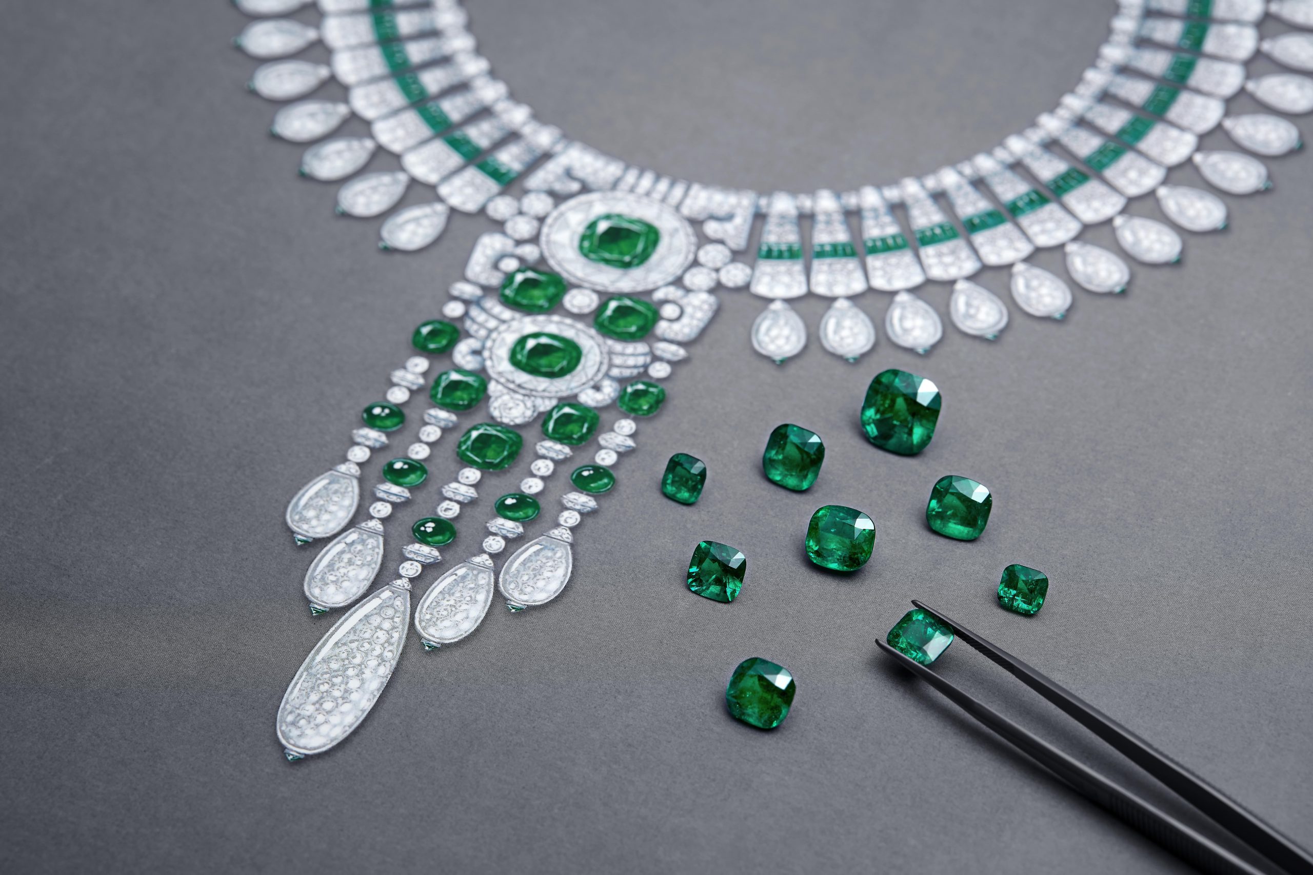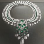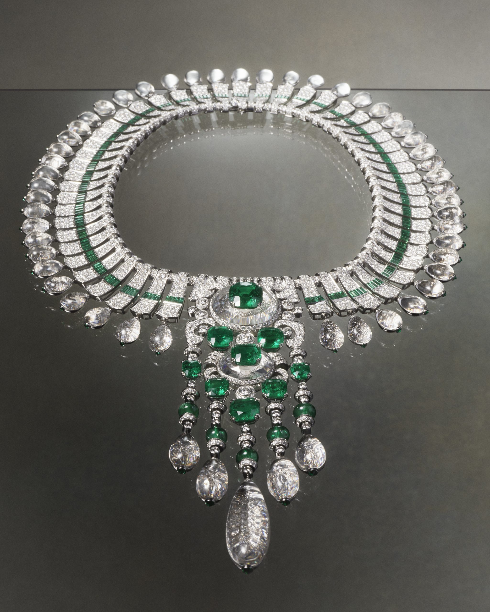 Highlight would be The New Maharajahs necklace as an art piece. Nine Colombian emeralds, for a total of 40 carats, compose the central motif, which can also be worn as a brooch. Once transformed, the necklace becomes a collar, lined with baguette-cut emeralds, fitting every movement of the body. In order to lighten up this necklace without altering its beauty, Boucheron has replaced the green gems placed at its ends in 1928 by diamonds. These diamonds are covered by rock crystal, which amplifies their brightness and emphasizes their flow.