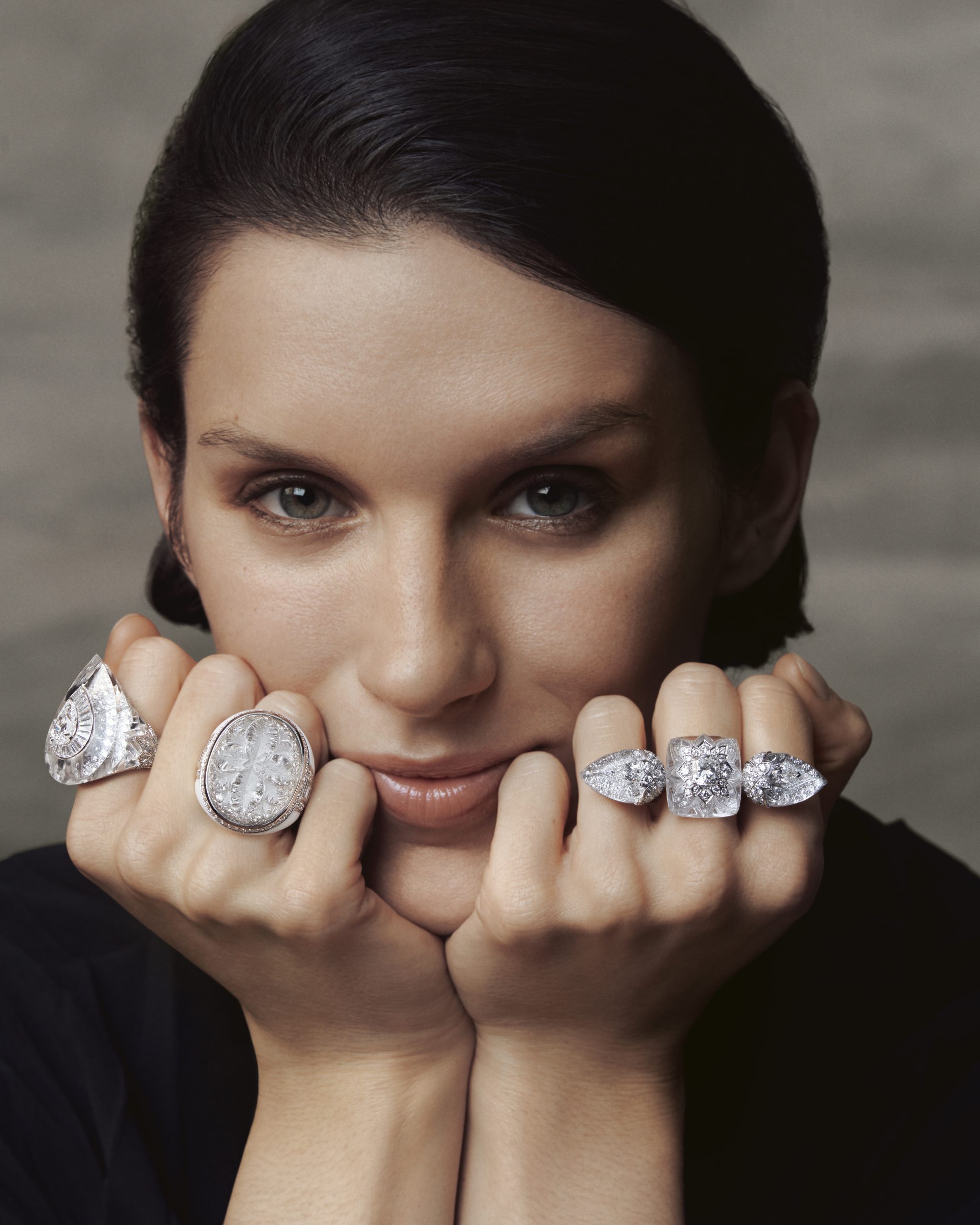 For these New Maharajahs, the creative studio has highlighted designs referring to elements which symbolize ancestral India, such as the lotus flower, turban ornaments or wedding bracelets, but also for traditional techniques such as glyptics, which is the art of engraving stones. To give life to her creative and contemporary vision, Claire Choisne has made the radical choice of purity through white and transparency, effects of scale that she has naturally transposed both on men and on women.