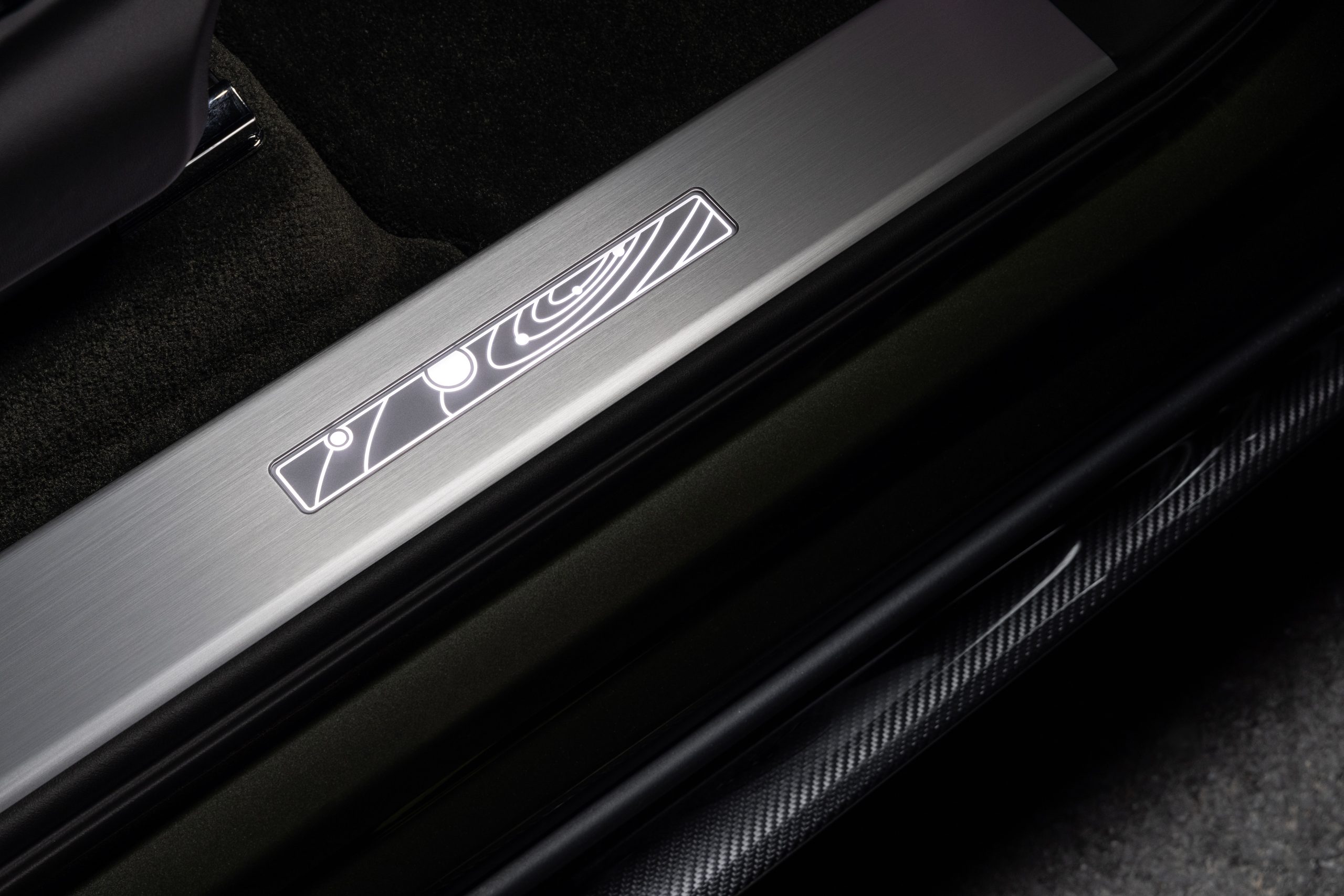Inside the beautifully crafted cabin, the first individual feature visible when opening the doors are the illuminated treadplates depicting planets orbiting a solar system. The eye is quickly drawn to the Orange bezels surrounding the Galaxy Stone fascias set into the dashboard and mirrored on the door waistrails. The smooth bright surfaces contrast the dark grey tactile stone emphasising the highly bespoke nature of this customer commission.