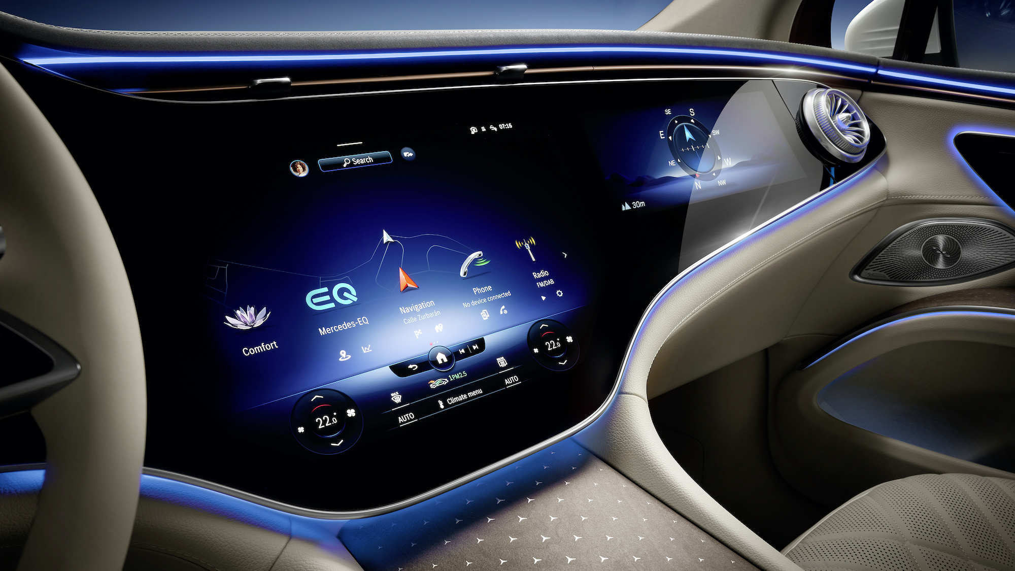 The highlight of the interior is the MBUX Hyperscreen (special equipment). This large, curved screen unit spans almost from A-pillar to A-pillar. Three screens sit under a common cover glass and merge visually. The 12.3-inch OLED display for the front passenger gives them their own display and control area. In Europe, and in a growing number of countries, the front seat passenger is also able to watch dynamic content while the vehicle is on the move. This is because Mercedes-EQ is able to rely on an intelligent, camera-based blocking logic: If the camera detects that the driver is looking at the passenger display, the system automatically dims the dynamic content.