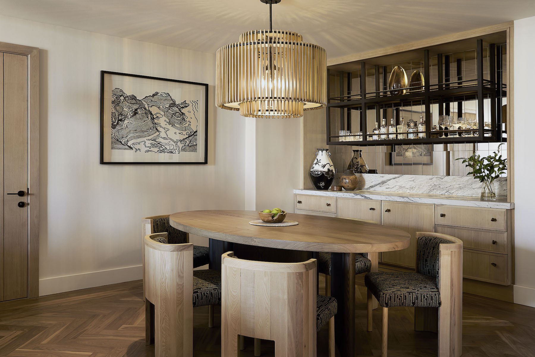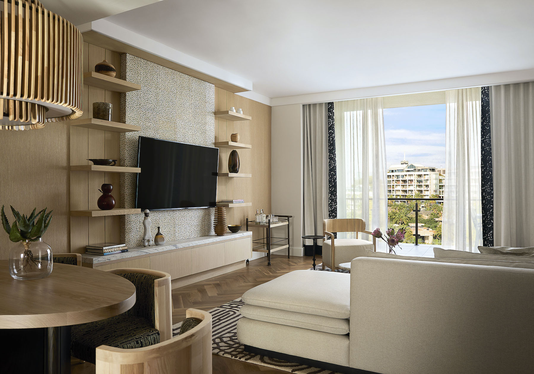 The suites offer space, repose and a journey of discovery. An extension of the overarching design concept but dotted with touches of green, the suites are a playful alternation of texture, use of lighting and colour, layered with honest natural minerals and unexpected objects. Limestone and African Ash feature tiles in the lobby, as well as statement tables and structural seating, complement the arrival experience. Both the reception and lounge spaces showcase individual identity with a balance of shadow and light, a colour palette of calm neutrals deep browns and warm earth tones, as well as exquisite African patterns.