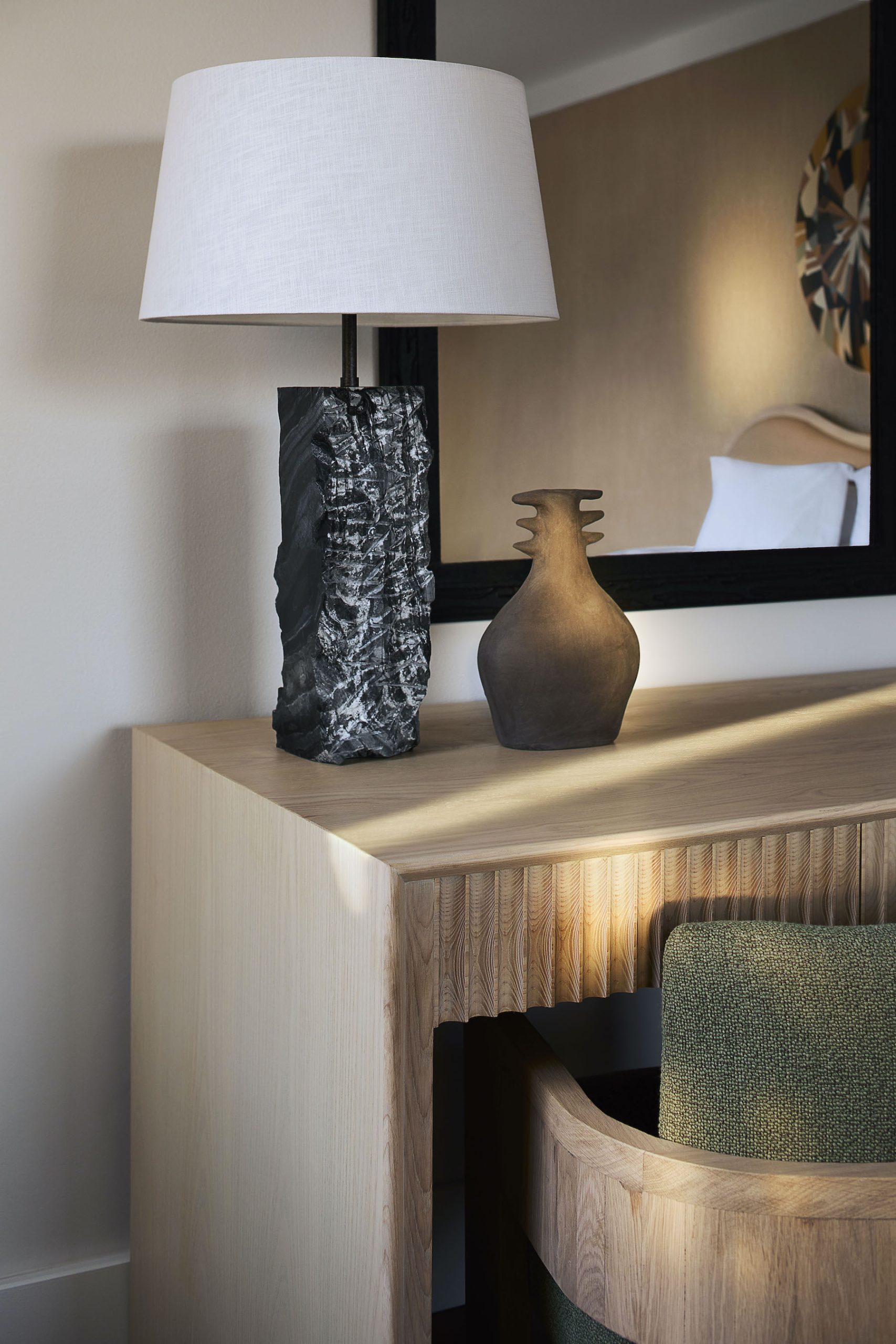 Guest room interiors have been crafted using thoughtful textures and organic materials, creating not just a space, but a whole experience and story. Entering the bedroom, warm lighting and an earthy colour scheme set the tone, the Kente cloth-adorned entrance, using fabric inspired by the traditional Northern African mud cloth, creates an authentically African welcome. The space is a perfect blend of metals and minerals, modernity and tradition. Every element is carefully considered, from the curved headboard of the bed which harmonises with the contrast of structural shapes and angles, to the handmade ceramics in organic shapes representing the textures and colours of Table Mountain: the golden yellow of the sun, the green of the plants and the blue of the sea, and the black texture of the Cape pine trees and silverleaf pine.