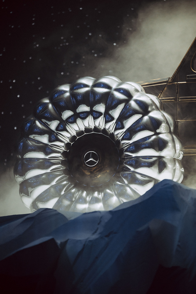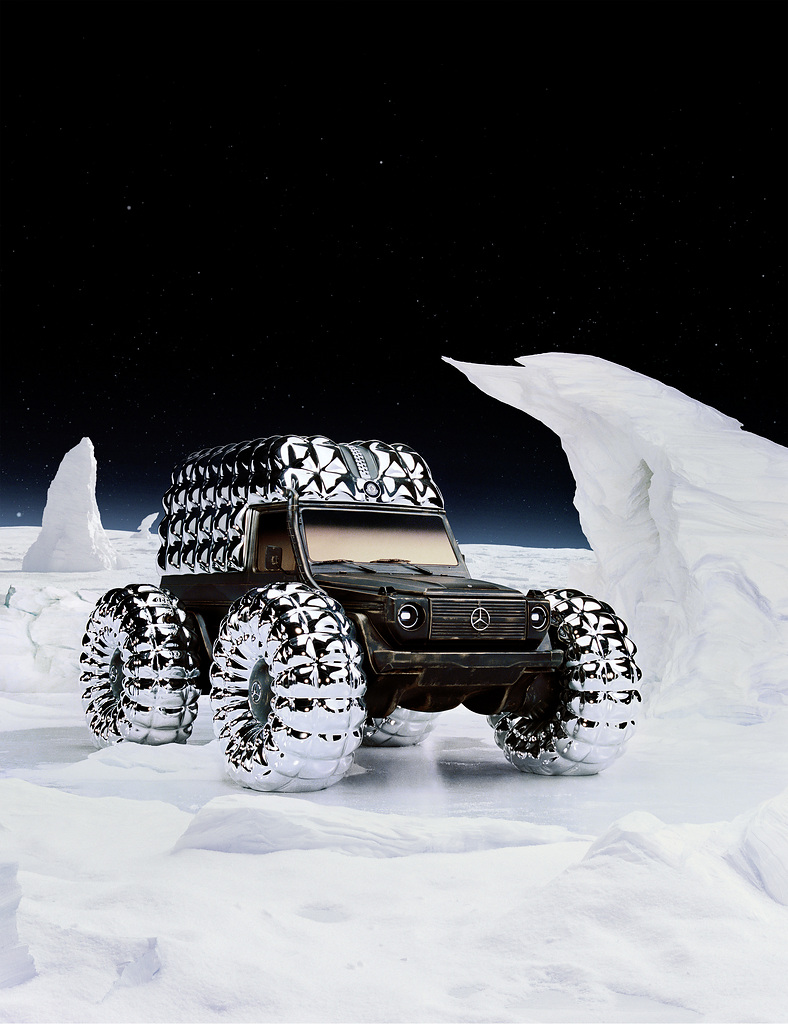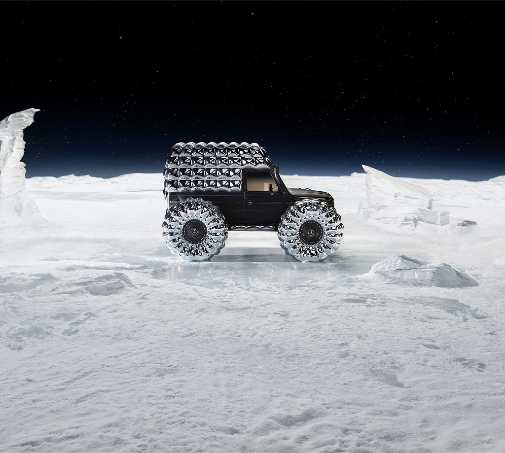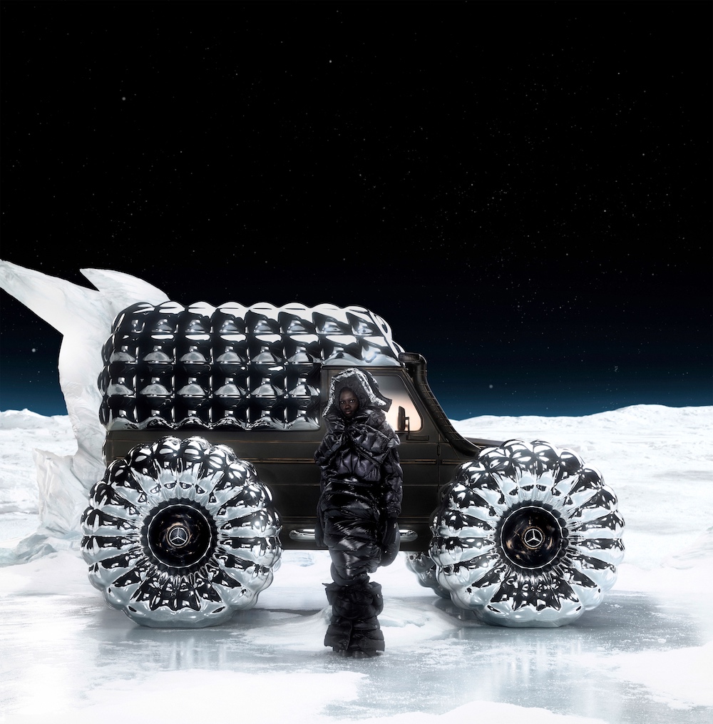 PROJECT MONDO G is the hero show car of the campaign that accompanies the Mercedes-Benz and Moncler co-creation with social media, out-of-home (OOH), and PR assets for a broad global activation. The visualization stages an otherworldly winter landscape inspired by the main themes of outdoor durability and limitless discovery opportunities with the off-roader G-Class as the basis of PROJECT MONDO G and the puffer jacket of Moncler. The look and feel is an imaginary universe with low gravity that interprets the art piece with fashionable moments by models wearing conceptual looks designed with Moncler collection items. The campaign set design mirrors the art piece reveal at the “The Art of Genius” show presenting the ability of the G-Class and the Moncler puffer jacket to withstand even the harshest conditions. The campaign was lensed by the recognized director and photographer Thibaut Grevet.