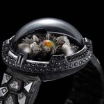 There’s the Big Bang condensed into a bracelet, and watches celebrating dinosaurs, gladiators, motor racing, and space travel. In regards to the materials, fossilised dinosaur bones, meteorite rocks, parts from F1 cars and Discovery Space Shuttle, ancient Roman coins, carbon fibre, Ethiopian opal cabochons, raw diamond slices, natural freshwater pearls, Oregon sunstone, agate, and ruby, to name a few. In addition, there are some rarer and more unusual minerals, like Larimar (the blue variety of pectolite found in the Dominican Republic), rainbow ammolite from fossilised ammonites, and peridot that’s still embedded in its volcanic lava matrix.