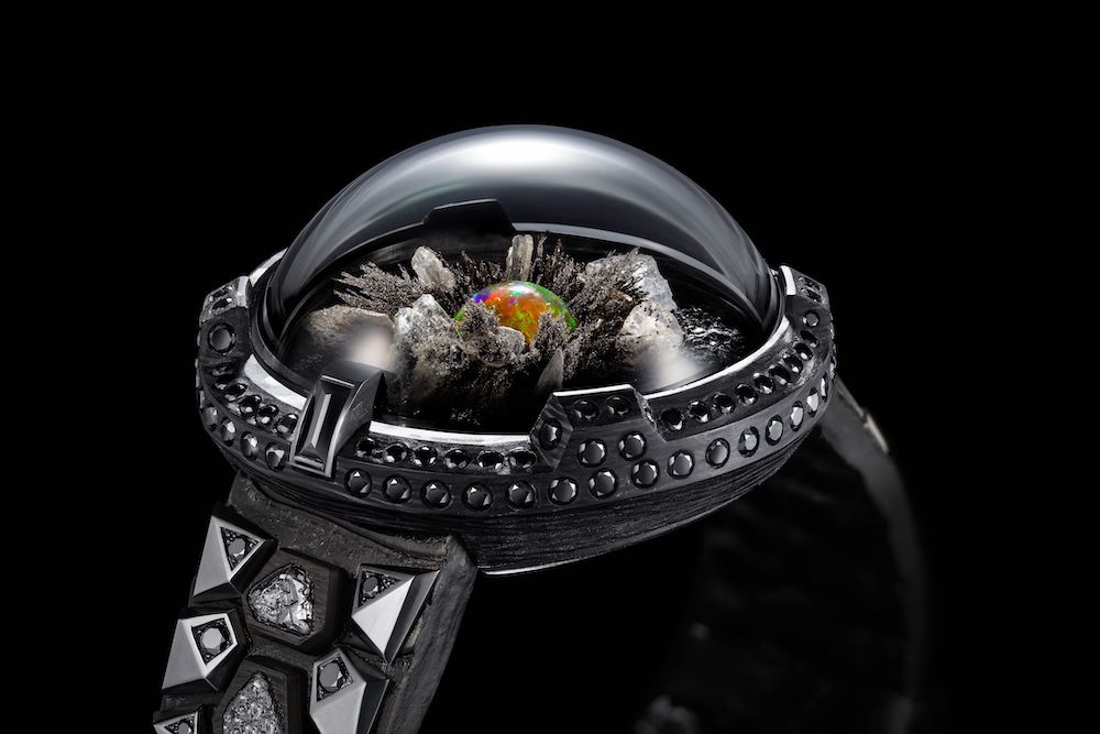 There’s the Big Bang condensed into a bracelet, and watches celebrating dinosaurs, gladiators, motor racing, and space travel. In regards to the materials, fossilised dinosaur bones, meteorite rocks, parts from F1 cars and Discovery Space Shuttle, ancient Roman coins, carbon fibre, Ethiopian opal cabochons, raw diamond slices, natural freshwater pearls, Oregon sunstone, agate, and ruby, to name a few. In addition, there are some rarer and more unusual minerals, like Larimar (the blue variety of pectolite found in the Dominican Republic), rainbow ammolite from fossilised ammonites, and peridot that’s still embedded in its volcanic lava matrix.