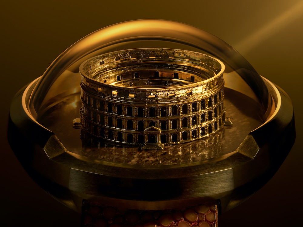 The Gladiators Eternity bracelet, for example, houses a miniature of the great Italian Colosseum under sapphire crystal glass with an authentic Roman coin from 124 BC used to decorate the buckle. The other half of this story – the Gladiators Quantum watch – features a softened octagonal titanium case coated in gold PVD, and adorned with a Sea bass skin leather strap, rough diamonds, and bronze fighters locked in battle on the dial.