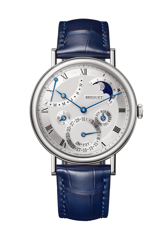 Breguet has opted for the 502 calibre to which the additional mechanism providing the calendar function has been added. With its thickness of 4.5 mm, the 502.3.P movement remains one of Breguet’s slimmest. It has been designed to provide high performance despite its thinness. Its open barrel increases finesse while guaranteeing constant, high-performance energy. Its gold oscillating weight is off-centred to provide maximum space for the movement’s main components. This allows it to be integrated into the smallest of spaces.